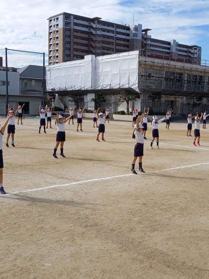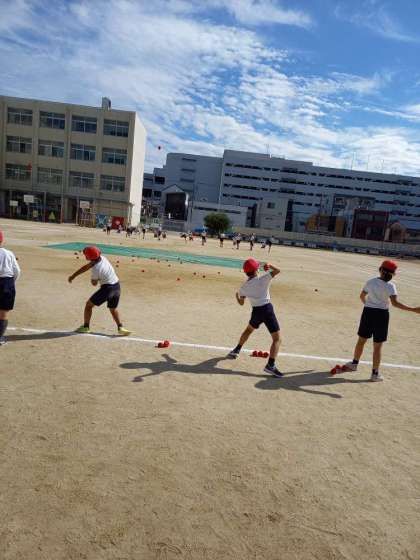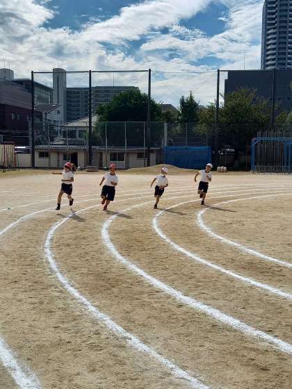 最初にラジオ体操をした後、ダンスを2曲踊りました。休憩の後徒競走をしました。最後はボール投げゲームをしました。