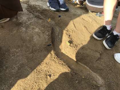 川を作り、カーブを作ることで、流れの内側と外側がどのようになるのか調べました。