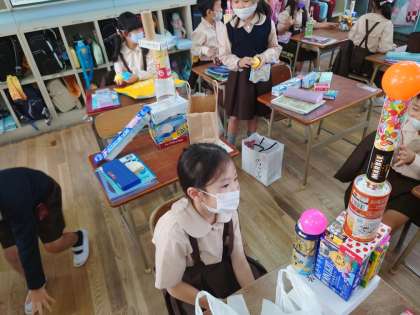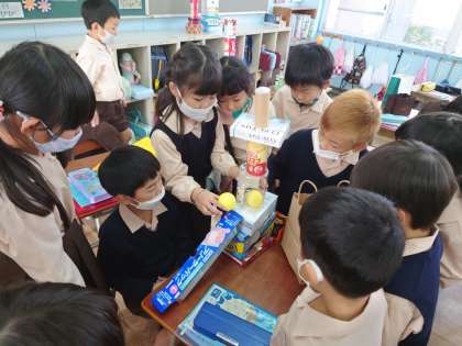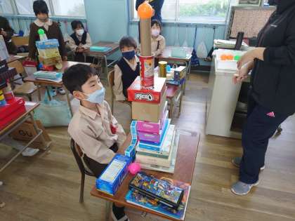 隣通しで持ってきた箱を高く積み上げていました。その中で平らな部分を組み合わて工夫して積み上げていました。