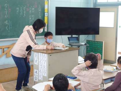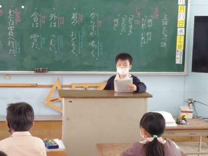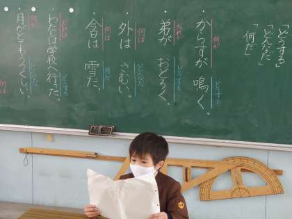 2年生が国語をしていました。主語と述語の学習が少し早く終わったので、それぞれが作っていた問題を出し、当てあいっこをしていました。