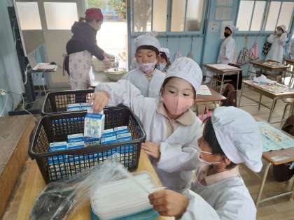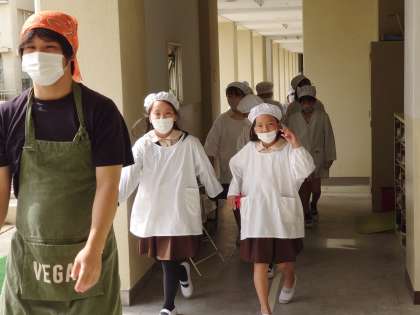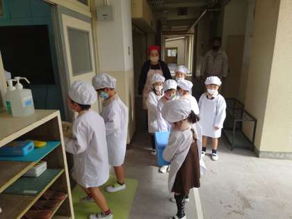 登校の時間、正門付近で、時間を待っている児童と給食の話をすると、「今日の給食はみそカツや」「おいしいで」と給食を楽しみにしている声が聞かれました。お待たせしました、給食の時間になりましたよ。