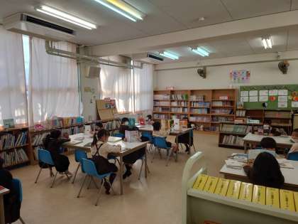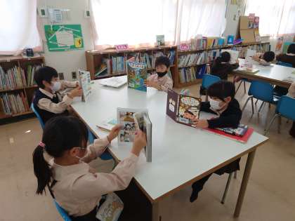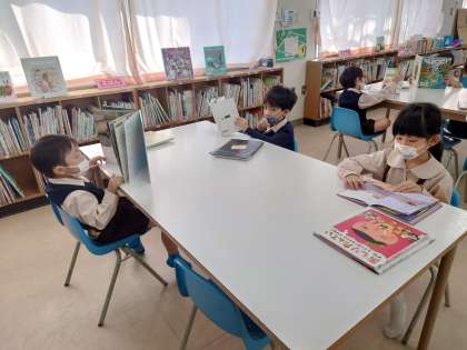 一年生が図書室にいました。とても静かに本を読んでいます。