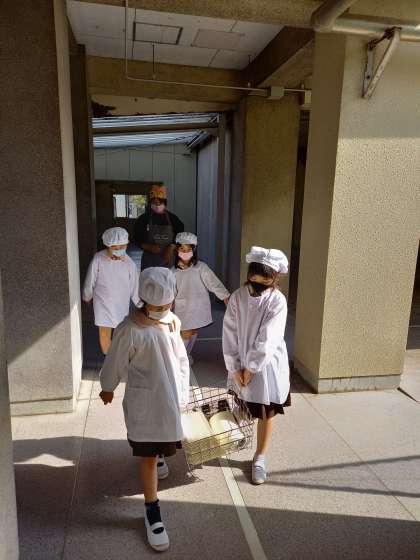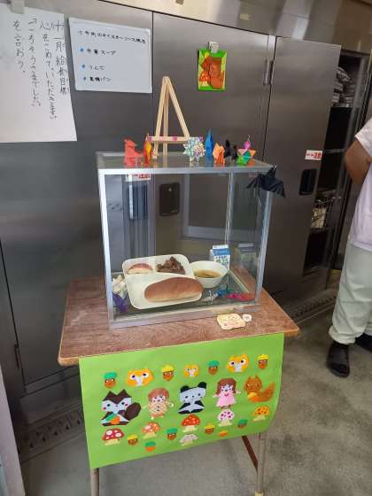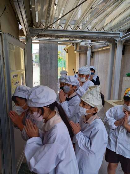 給食の準備が始まりました。今日の給食は、牛肉のオイスターソース焼き、中華スープ、りんごです。