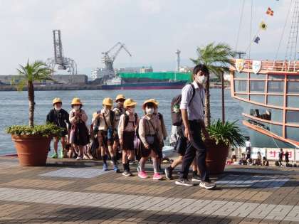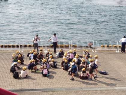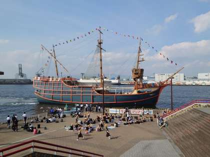 サンタマリア号が通っていました。お弁当を食べ終わり、今から天保山に向かいます。