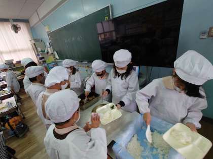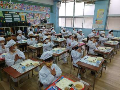 今日は就学時健康診断のため少し早めに給食の準備をしています。