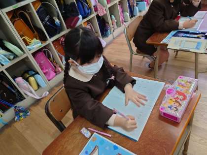 一年生お隣も11−8をしていました。10から8をとって2、2と1で3となります。