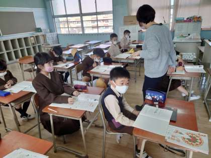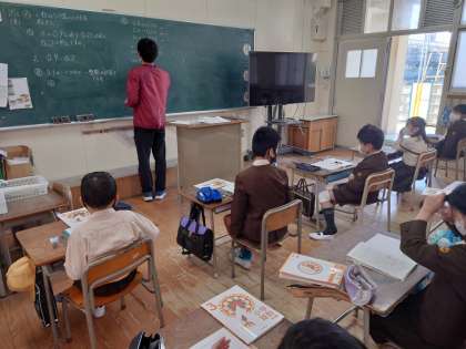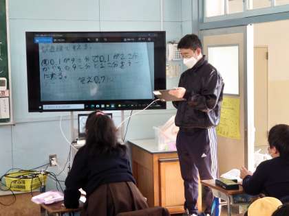 3年生が算数をしていました。小数の計算です。最初は整数で計算できるよう、図や0.1のいくつ分などの考え方で計算します。