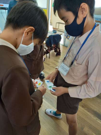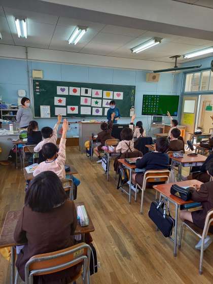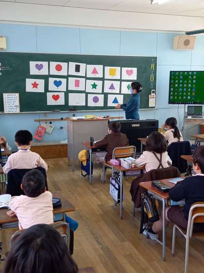 4時間目に3年が外国語活動をしました。挨拶とABCの歌を歌った後、ミッシングゲームやキーワードクイズ、チャンツなどを通じて色と形を英語で話す学習をしました。