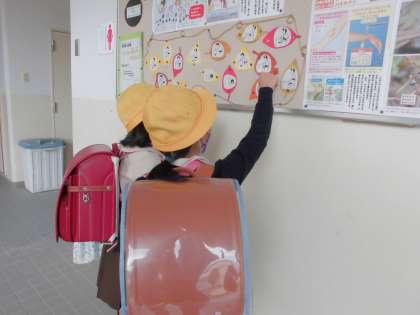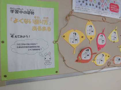 今、保健室横の掲示板では、16通りの「よくない座り方あるある」を掲示しています。