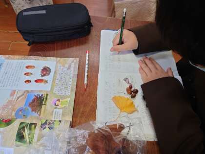 4年生が理科をしていました。秋の生き物の学習です。オリエンテーリングで、どんぐりやイチョウの葉っぱなどを取って観察していました。