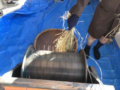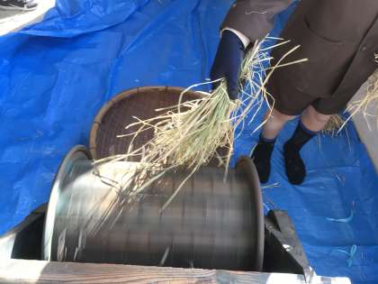 写真のような昔ながらの機械を使って、脱穀していきます。