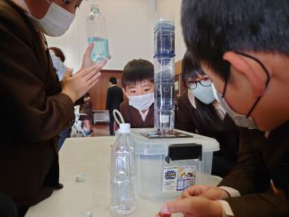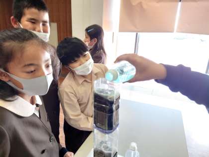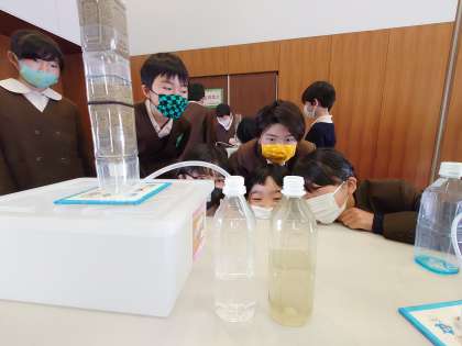 汚れていた水と見比べています。その後、においの代わりに青色水を作って活性炭素の中を流すと色が透明になりました。
