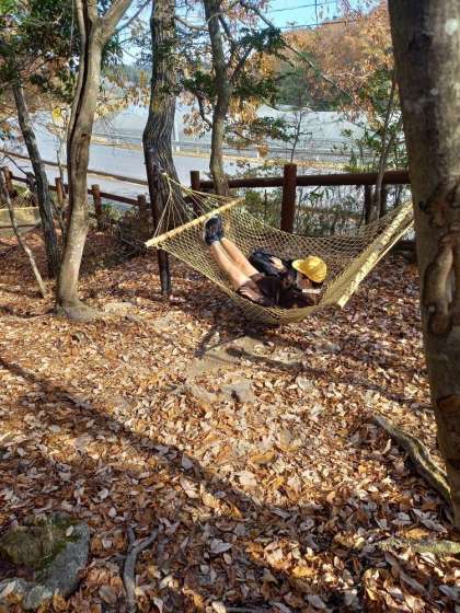 こぶたショーまで時間があるので、ザリガニ釣りやハンモック、ヤギの観察など楽しんでいます。