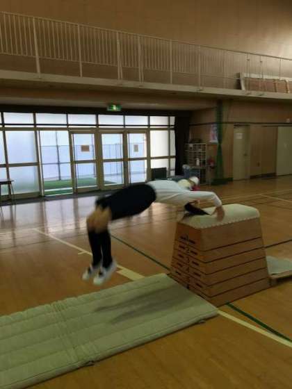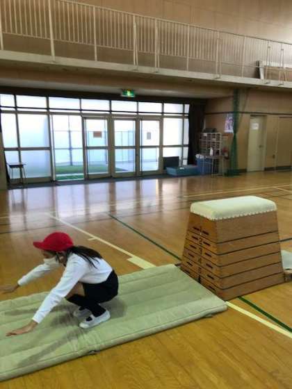 体育科では、台上前転がきちんとできていて、安全に技ができる児童から、台上前転の発展技である首はね跳びを練習しています。