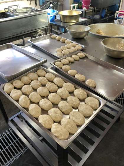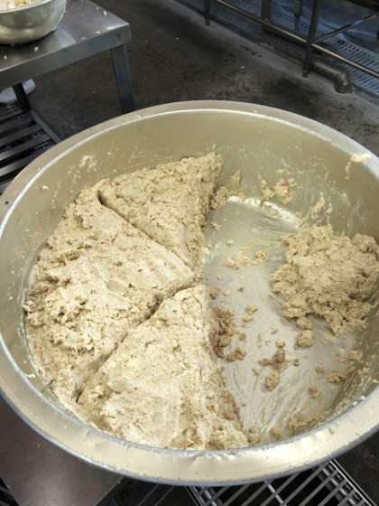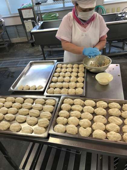 とうふハンバーグはツナと豆腐と玉ねぎなどを混ぜ合わせ、そこから一人分約57グラムを丸めていきます。最初の一個をはかりで測って、後は一個目と同じ大きさに丸めていきます。400近いハンバーグを丸めています。