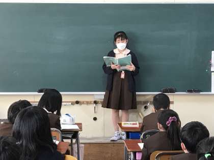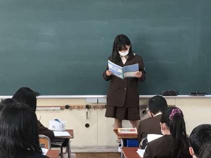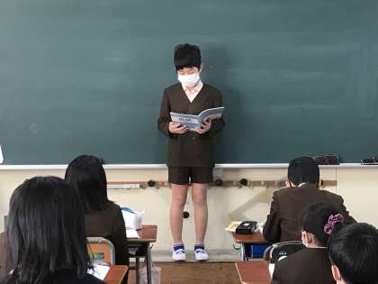 写真は前で発表している様子です。改善案を必死に考え、上手な意見文を書くことができました。