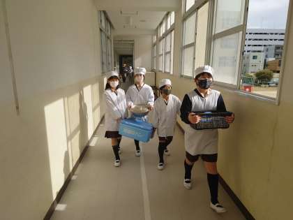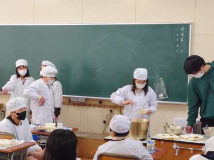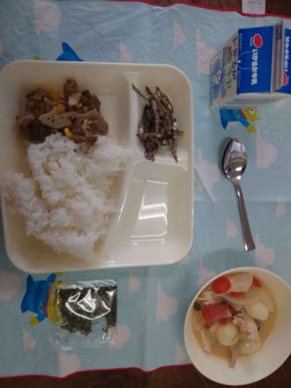 今日は正月献立です。雑煮やごまめ、れんこんのちらし寿司です。ごまめは田作りともいいますね。
