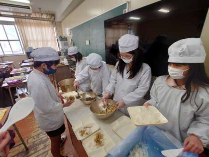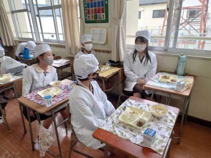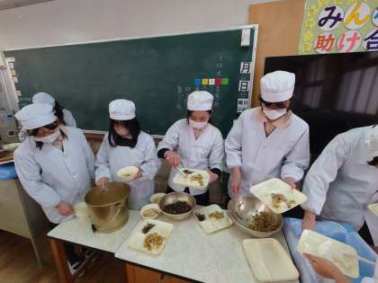 雑煮に人気があるようです。給食のお餅は白玉もちなので小ぶりとなっています。ニンジンは金時ニンジンを使っています。