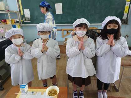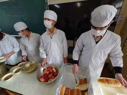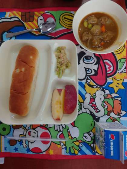 パンです。低学年のりんごは食べやすいように4分の1ではなく8分の1に切って、2個入っています。