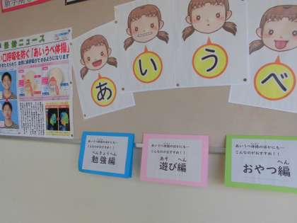 3学期の発育測定では、鼻呼吸に効果のある「あいうべ体操」を紹介し、全クラスが終わったので掲示板に貼りだしました。