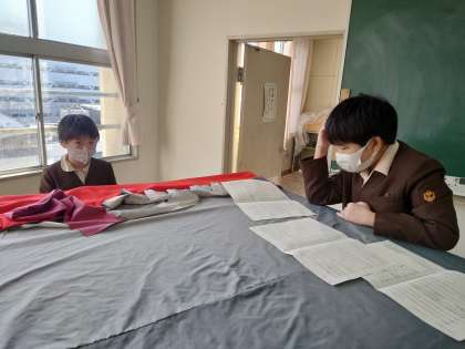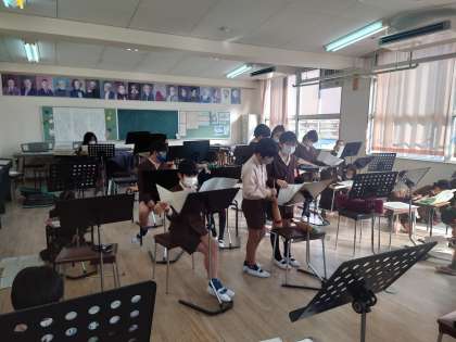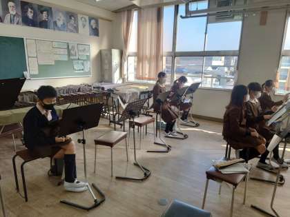 5年生が音楽室にいました。合奏の曲を譜面を見ながら聞いていました。