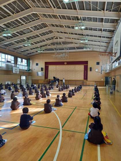 本日2時間目に低学年、3時間目に中学年、4時間目に高学年の音楽鑑賞会をしました。もちろん間隔を開けて座ったり、講堂に入る前に手指の消毒をするなどの感染症対策をしっかりして行いました。