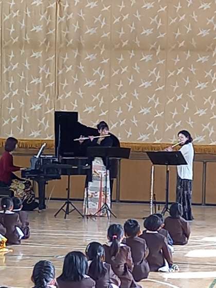 大阪は明日からまん延防止等重点措置が発出されます。それにより音楽の学習にさらなる制限がかかります。そこで今日は演奏家3人に来校していただき、フルートなどの音色を実際に聴く良い機会をつくりました。子どもたちは静かに熱心に聴いていました。