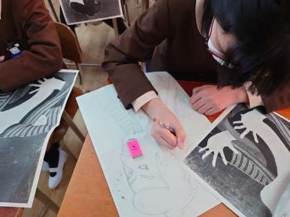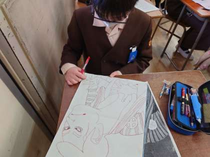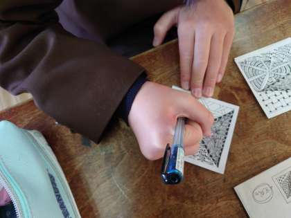 6年生が図工をしていました。写楽の下書きが終わっている児童はゼンタングル(小さな紙にペンだけを使って描くアートのことだそうです)を描いていました。