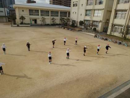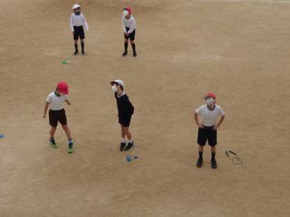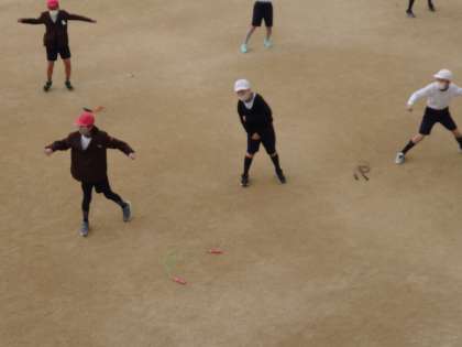 四年生が体育をしていました。始まったばかりで、体操、ダンスをしていました。次は縄跳びが始まりそうです。