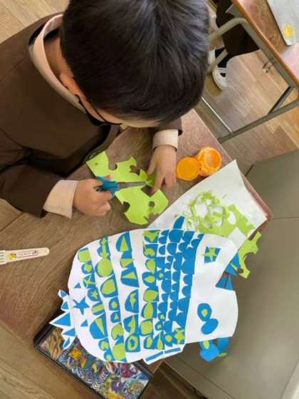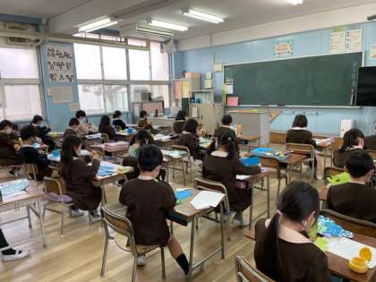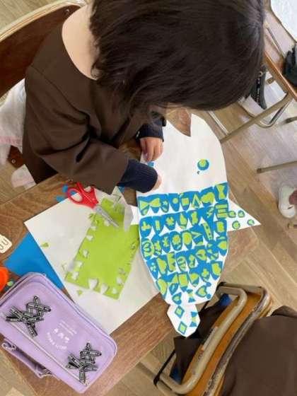 1組 図画工作の学習の様子です。魚の版を作っています。版ができたら、インクをつけて刷ります。どんな出来上がりになるか楽しみです。