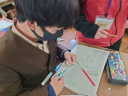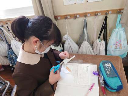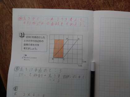 5年生が算数をしていました。写真のように平行四辺形を長方形に変身させて面積を求めていました。