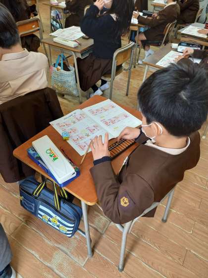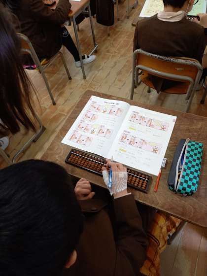 3年は今日そろばんの出前授業がありました。初めてのそろばんで戸惑っている児童もいましたが、次第に慣れて、2桁の足し算をそろばんで計算できるようになりました。