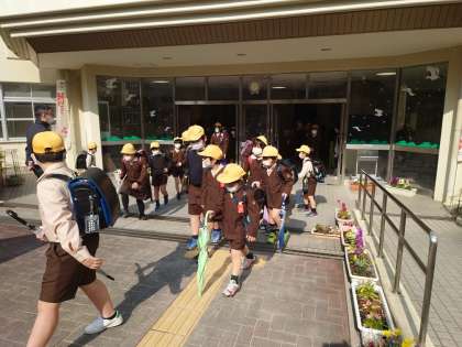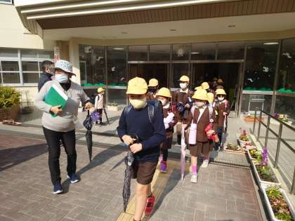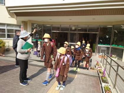 5時間目が終わったので、新しい班長さんを先頭に集団下校しています。
