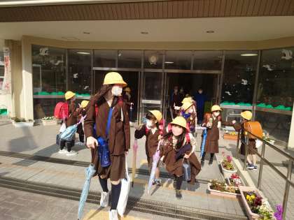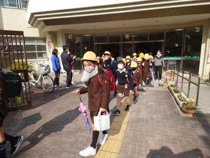 集合場所の確認をするので、下校も集団で帰っています。何度も言いますが明日はいつもの登校班です。