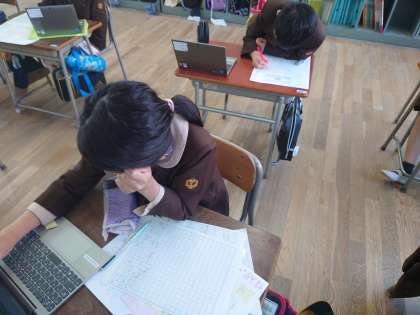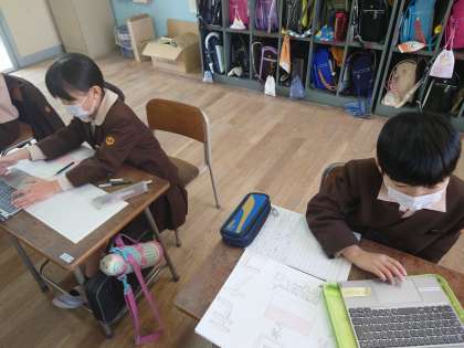 3年生が国語をしていました。それぞれが調べた国について文にまとめていました。タブレットを見ながら書いている児童もいました。できた児童はナビマをしていました。