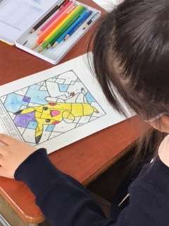 ジンギー先生に英語を教えてもらいました。色と20までの数を習いました。数と色を言ってもらって、塗りました。