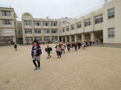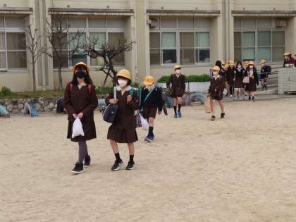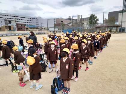 令和3年度修了式は運動場で行います。各学年運動場に集まってきています。