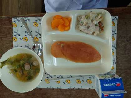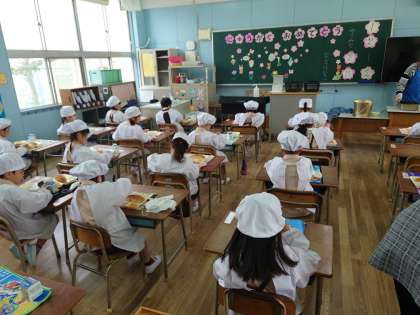 一年生、鶴見小学校での初めての給食です。