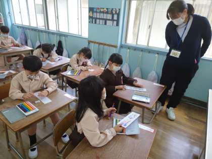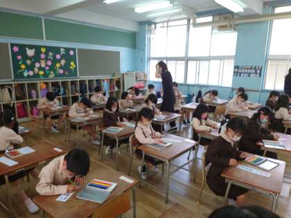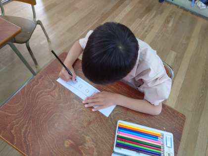 1年生が日直カードに色をぬっていました。できた子は裏に絵を描いていましました。