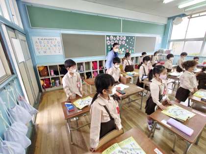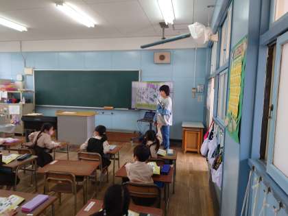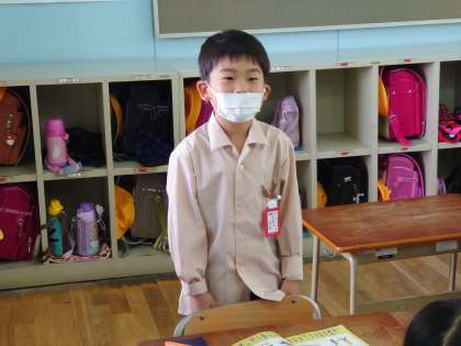 おとなりでは国語をしていました。おはよう、ありがとう、ごめんね、はい、遊ぼうなど人とつながる言葉の学習をしていました。
