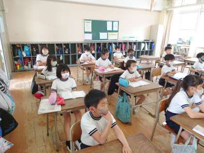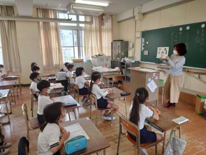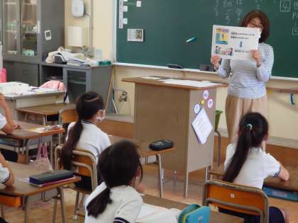三年生の教室をのぞくと、保健の先生が、発育測定前のお話をしていました。これから発育測定です。