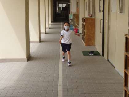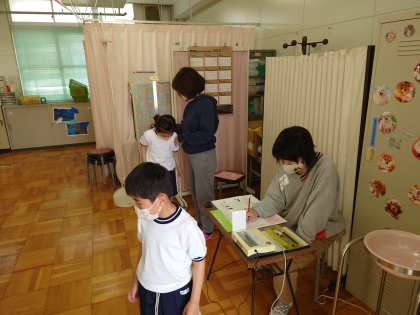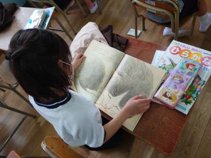 1年生が発育測定をしていました。前後半に分かれて発育測定です。待っている児童は本を読んでいました。