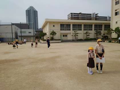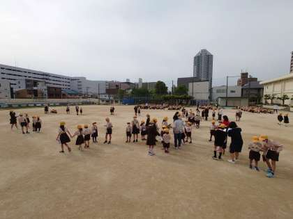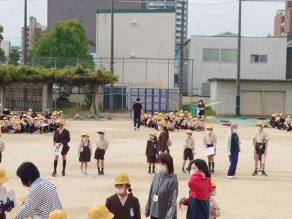 朝の時間と、1時間目を使ってキッズファミリーはじめまして集会を行いました。鶴見小学校では木曜日に縦割り集会を行います。今日はその顔合わせです。一年生は班長さんが集合場所まで連れて行ってくれます。