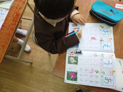 1年生がひらがなの学習をしていました。「お」です。
