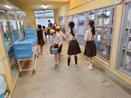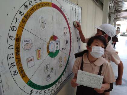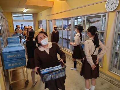 給食委員会の子どもたちが手伝ったり、黒板に次回の献立を書いたりしています。