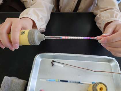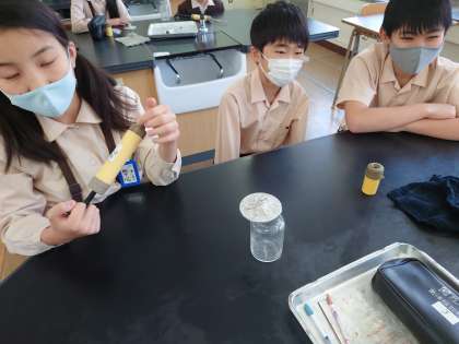6年生が理科をしていました。ろうそくを燃やした後の二酸化炭素の量を調べていました。