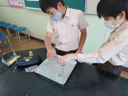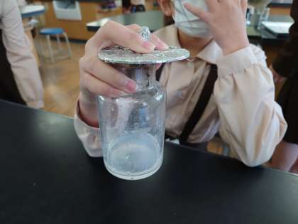 次に集気瓶でろうそくを燃やし、石灰水を入れて調べていました。白く濁ると実験成功です。