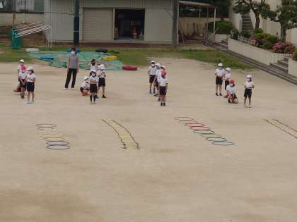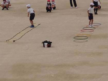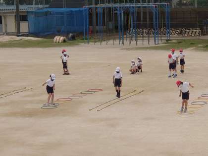 3年生が体育をしていました。リズムに合わせていろいろな動きをしていました。