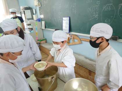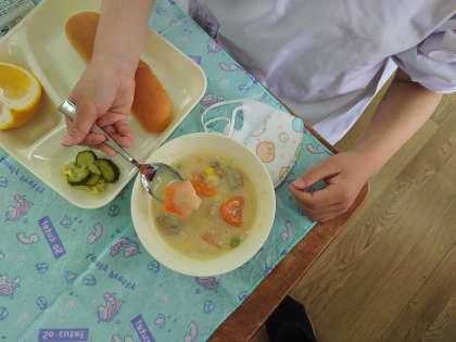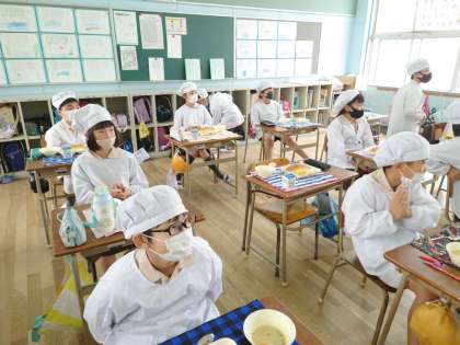 一年生の教室をのぞくと、コーンクリームシチューにハートや星、花びらの形をした人参が入っていると嬉しそうに教えてくれました。
