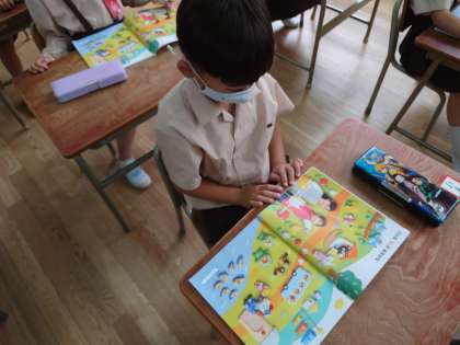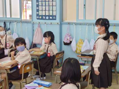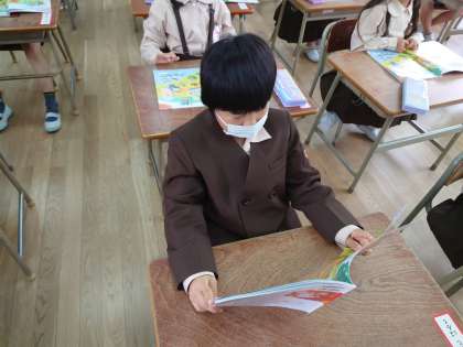 1年生おとなりは音楽でした。チューリップやちょうちょうなど、教科書の絵を見ながら聞いていました。